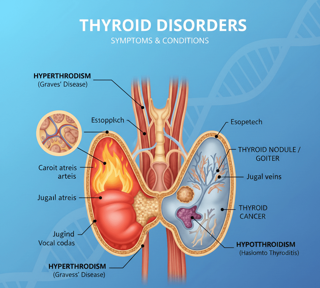 Diagnosis and medical management of hypothyroidism, hyperthyroidism, and related conditions.